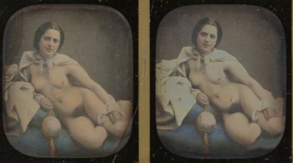 Louis Camille d’Olivier. Nude female on bed 1854. Stereograph daguerreotype hand colored