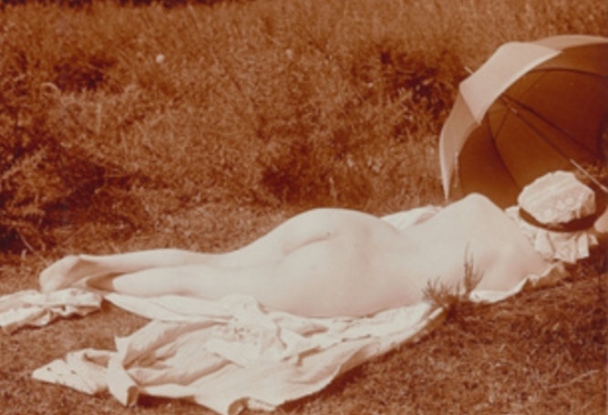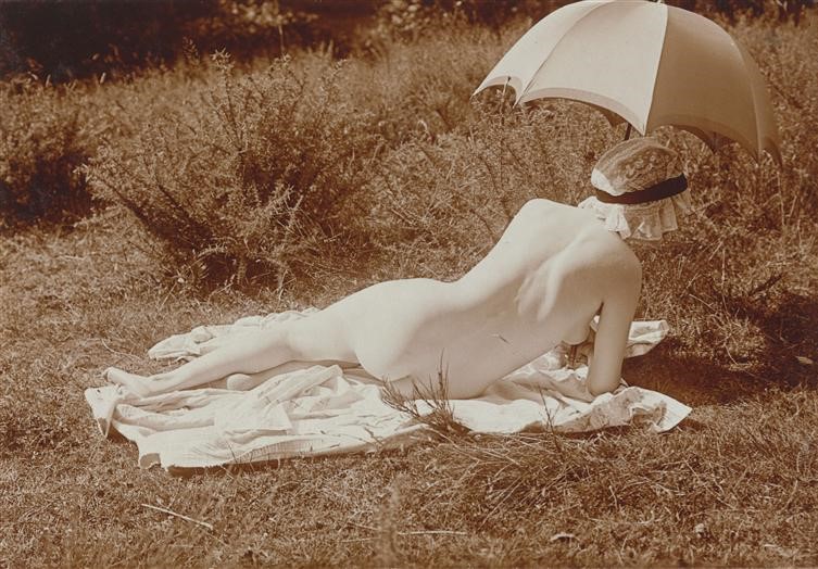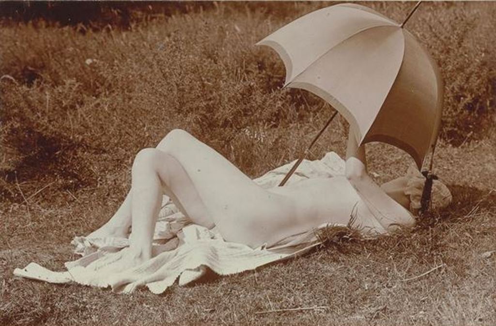 Charles Augustin Lhermitte. Jeune femme nue dans un pré se reposant sous une ombrelle 1912