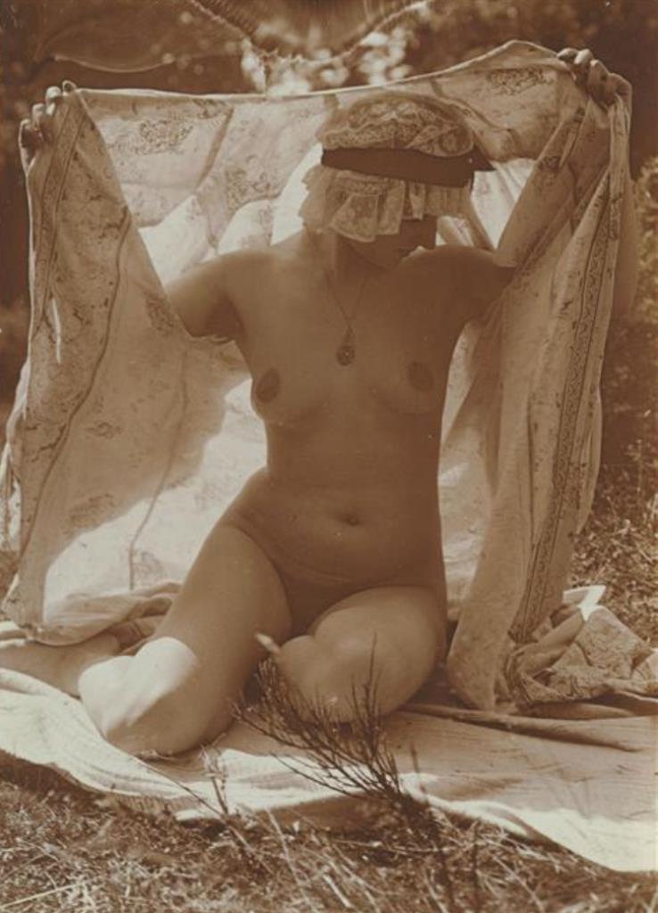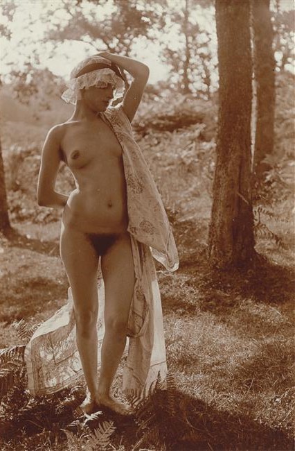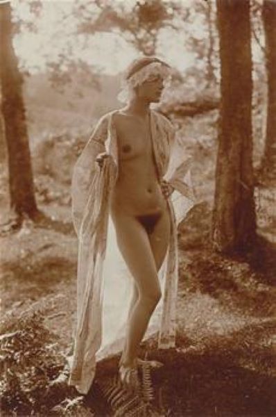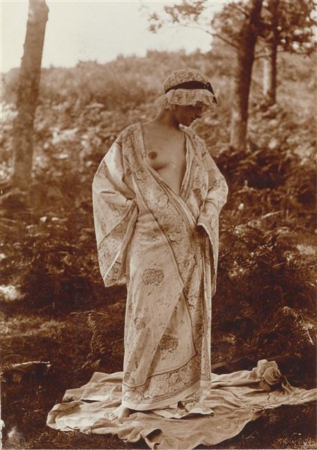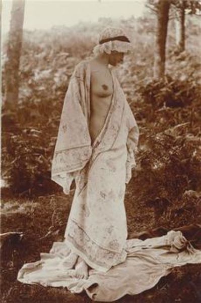 Charles Augustin Lhermitte. Jeune femme en peignoir et coiffe, posant dans une clairière de fougères 1912.